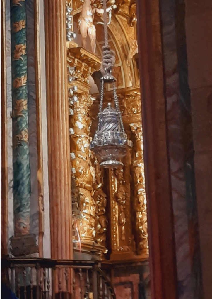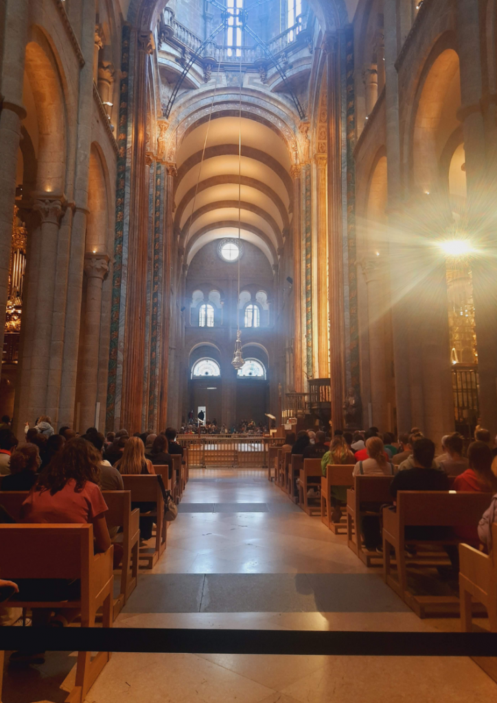 Das Ankommen auf dem Platz, das Anstehen, um die Compostela (die Pilgerurkunde) in den Händen zu halten, ist ein wunderbares, gemeinschaftliches Ritual. Es ist die physische Bestätigung der eigenen Willenskraft. Und die Belohnung? Nach Tagen des Pilger-Essens schmeckt mir die erste richtige Paella in der Stadt wie der größte Sieg deines Lebens! Man ist angekommen, aber die Reise ist noch nicht vorbei. Zu einem der Rituale gehört die Pilgermesse in der Kathedrale von Santiago de Compostela. Der berühmte Weihrauchbehälter in der Kathedrale von Santiago de Compostela heißt Botafumeiro (galicisch ist und so viel bedeutet wie „Rauchverteiler“), es ist ein riesiges Weihrauchfass, das zu besonderen Anlässen von der Decke geschwungen wird und zu den Hauptattraktionen der Kathedrale gehört. Zusammen mit der gesprochenen Messe, der Musik ist es definitiv für jeden Pilger und jede Pilgerin ein Muss, was auch die langen schlangen am Eingang vor jeder Messe zeigen.